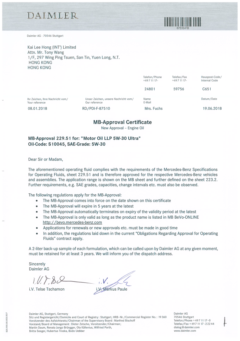 MB-Approval 229.51, for S10045 Motor Oil LLP 5W-30 Ultra
