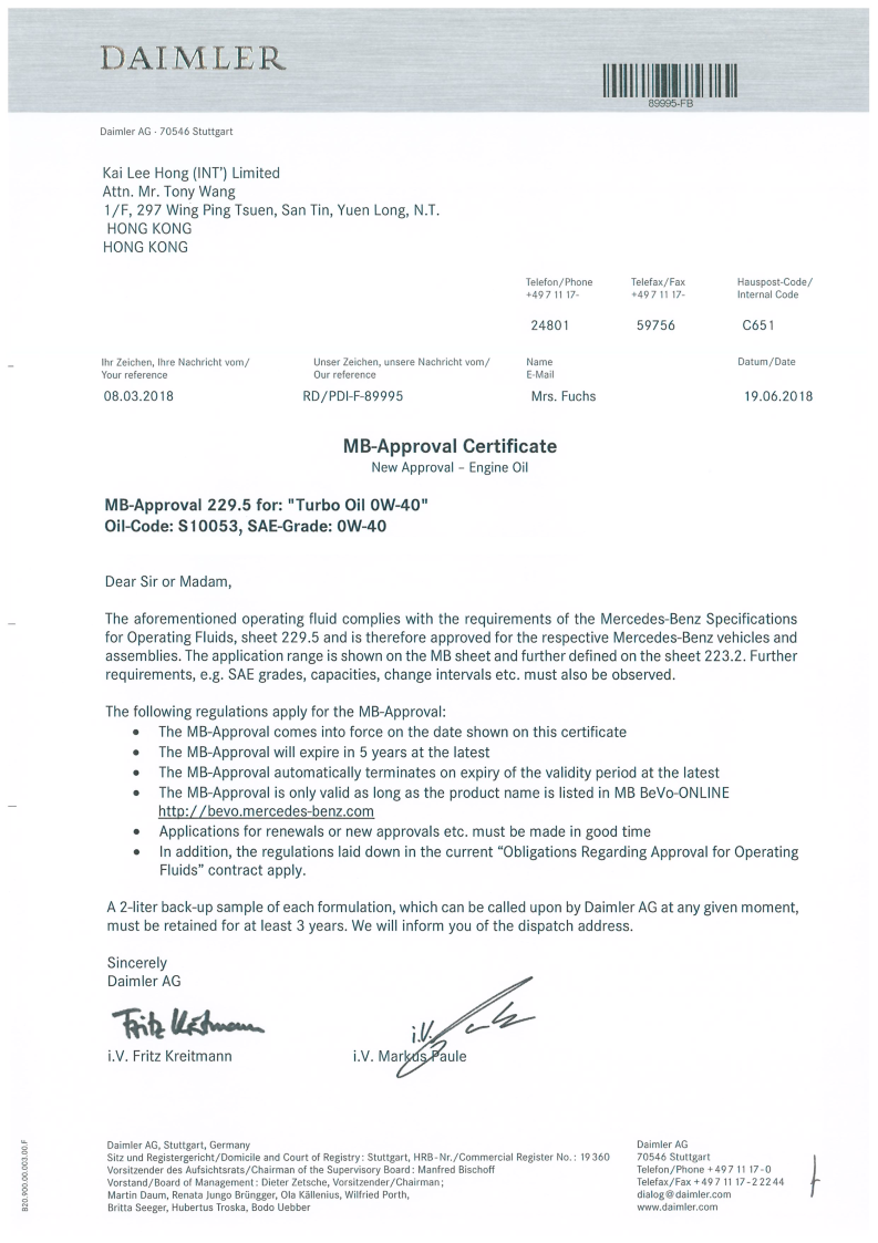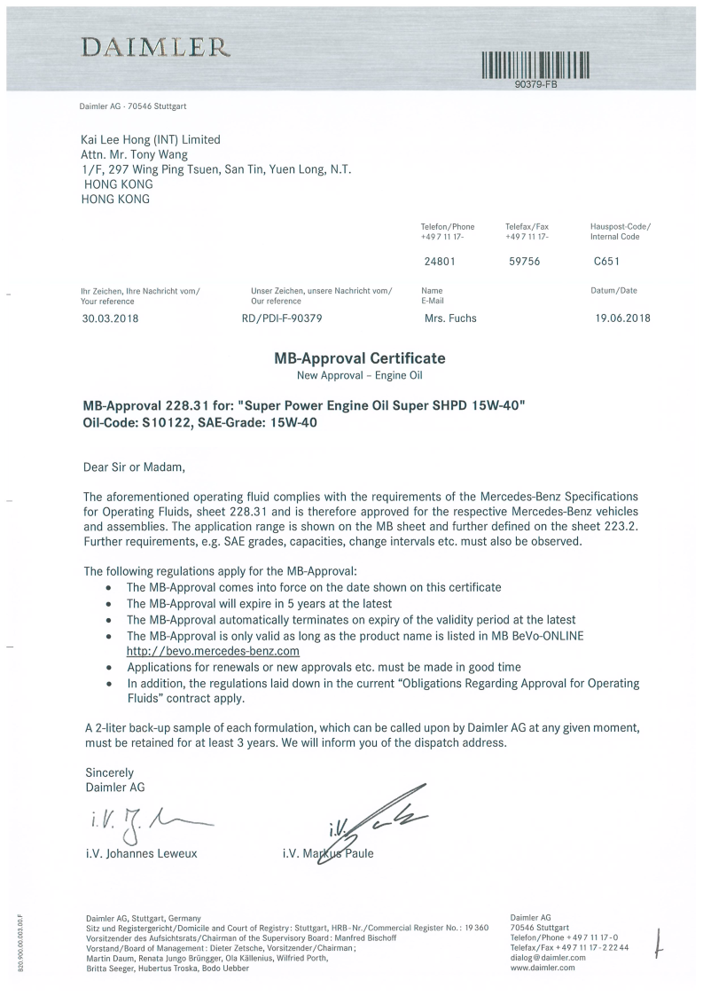 Super Power Lubricants have received MB-Approvals from Mercedes-Benz.